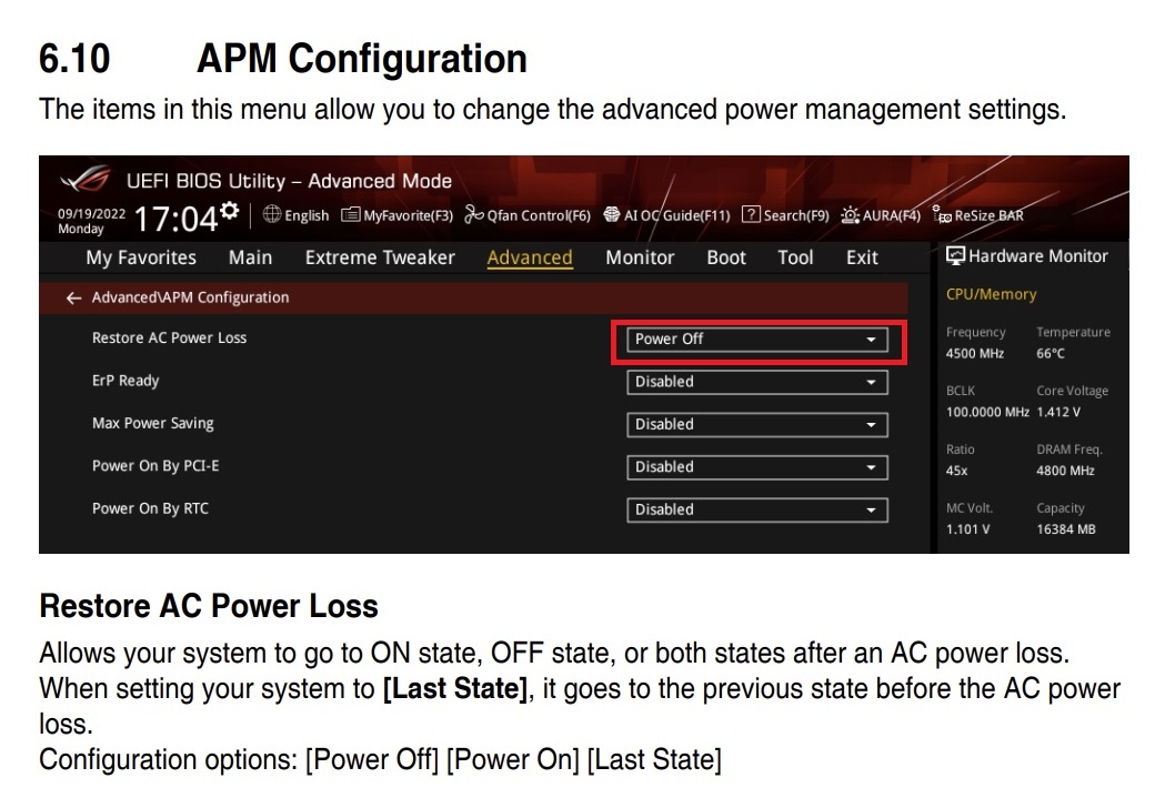 Najdi v BIOS něco jako [F7] Advanced, (Automatic Power management) APM configuration, After power lost ...