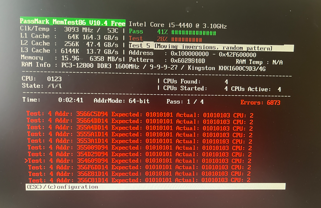 Tak se mi postupným zkoušením podařilo identifikovat jeden vadný modul, který když zapojím (v jakékoli kombinaci), tak po zapnutí testu okamžitě začnou vyskakovat chyby. Zkoušel jsem i v různých slotech (abych vyloučil, že je špatný nějaký slot). Zajímavé (nebo asi ani tolik ne) že i když jsem ho zapojil samotný, tak pc normálně naběhne a jeví se funkční.