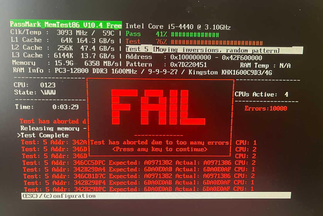 Chyby jsou mimo jiné třeba na adrese 3566C5D94h (cca 14GB), což v cache není. Vypadá to na jeden vadný modul. Testuj postupně každý modul zvlášť.