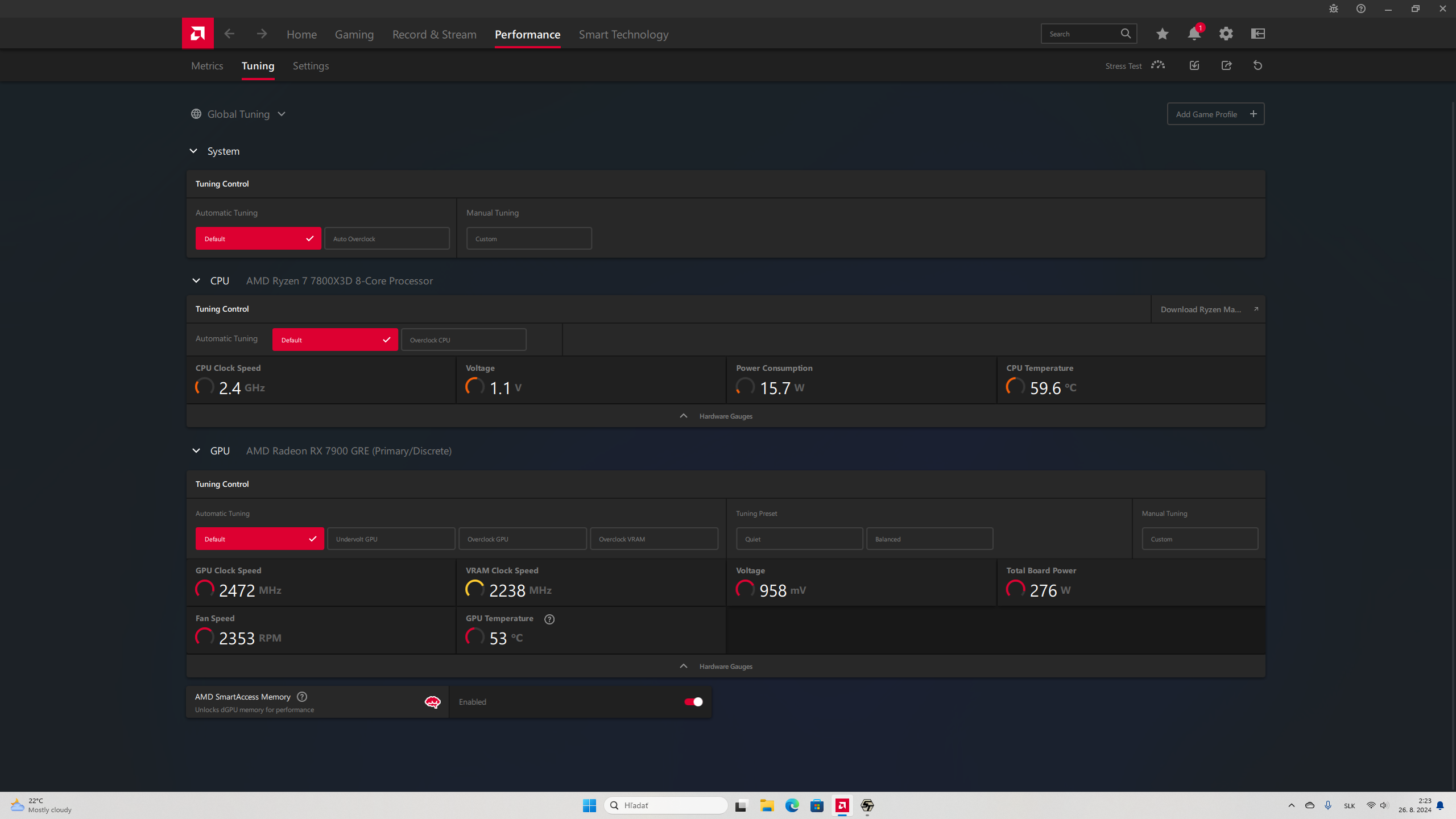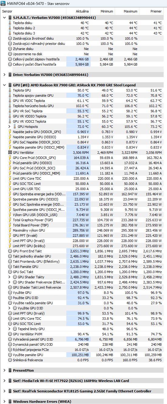 Tak a ještě doplněk pro ověření, že nekecám. První foto je s AMD default nastavením a HWiNFO64, tentokrát ořezané, snad to bude lepší LOL. Druhé foto je AMD, ale větráky na maximum 100% oproti původnímu nastavení 71%, a taky k němu přikládám foto z HWiNFO64. Jak uvidíte na fotkách, rozdíl je minimální a ani o tisícovku vyšší rychlost větráku nepomohla snížit teplotu o moc. Konkrétně 71% větráky měly 55 stupňů na grafice a 109 na hotspotu, momentálně je v izbě tak kolem 25 stupňů, takže taková trochu vyšší pokojová teplota, a 100% větráky měly 53 stupňů na grafice a 106 na hotspotu, takže celkově rozdíl 2-3 stupně, což není ani 5%. Takže jo, grafika je na 100% špatná a docela mě to šokovalo, protože hlasitost větráku na 3500 otáček byla neúnosná, jako kdybych měl vysavač zaražený do ucha, celkem utrpení, a to jsem to testoval jen asi 5 nebo 10 minut.