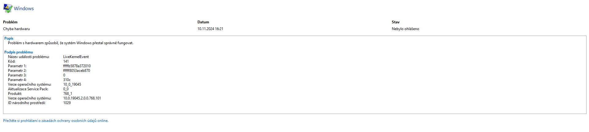 Mohlo se jednat o BSOD , zkusil bych se podívat do BSOD Vieweru od NirSoftu https://www.nirsoft.net/utils/blue_screen_view.html , dole kliknout na Download BlueScreenView 64-bit (in Zip file) . Pokud tam tento záznam bude, tak dvakrát na něj poklepej a opět pošli screenshot.