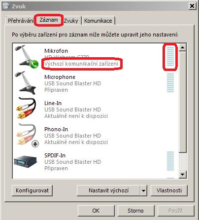 1. Máš mikrofon nastavený jako výchozí komunikační zařízení? Když na mikrofon mluvíš, ukazuje něco indikátor hlasitosti vpravo?