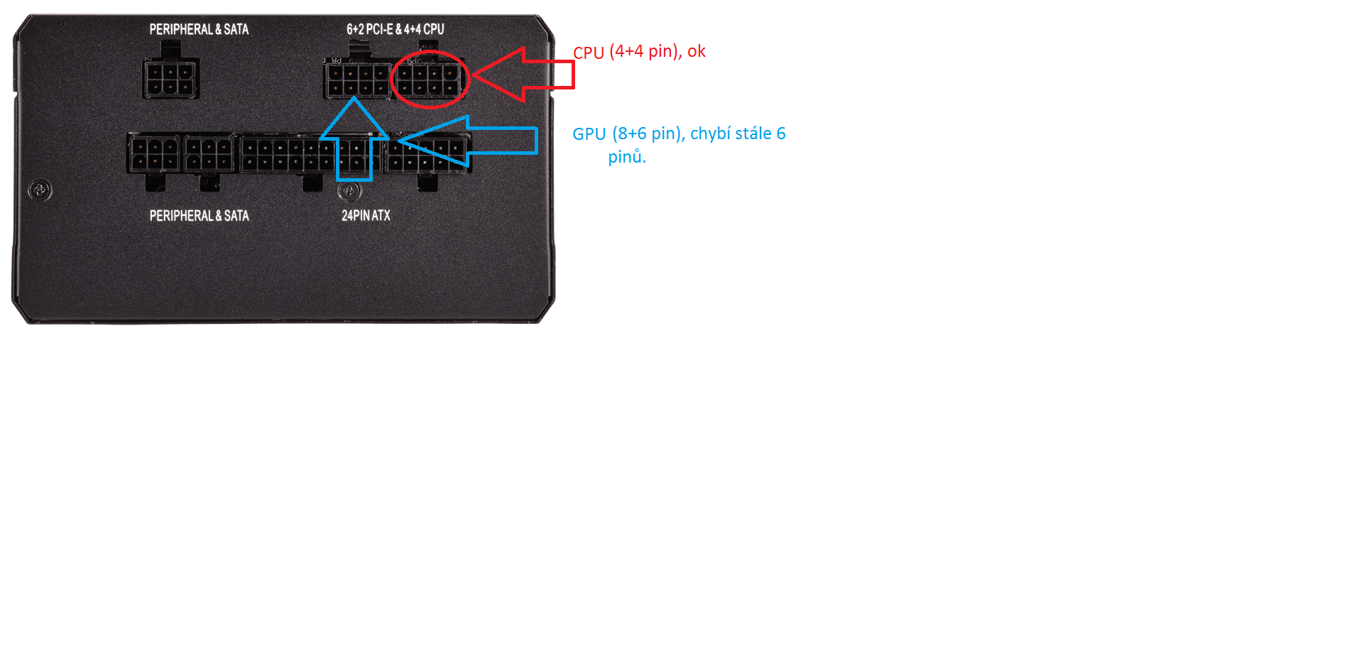 Na CPU potřebuju 8 pinů, na gpu 14pin=22pinů. na PSU je pouze 16 pinů... Stále tam těch 6 chybí...