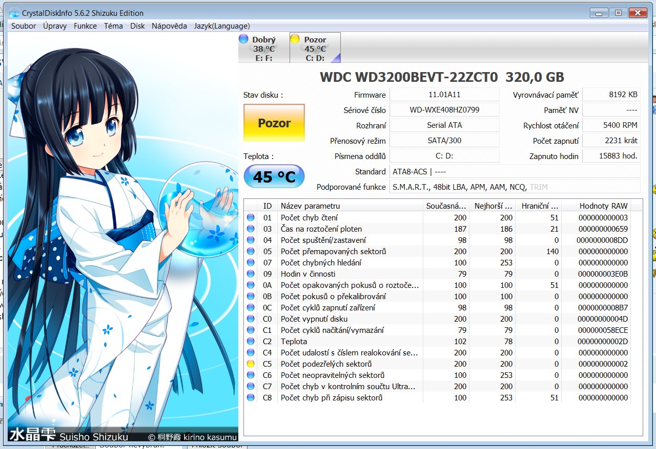 Počítač zamrzá v různých intervalech i situacích. Někdy hned po nabootování, někdy během činnosti, někdy během nečinnosti, když je pouze spuštěný na stole, bez jakýchkoliv aktivních uživatelských programů. Zapátral jsem na PC-Help fóru a přišlo mi, že bych mohl mít stejný problém, jako tento uživatel: viewtopic.php?f=39&t=116647 proto rovnou přikládám screey z programů CPIID a CrystalDiskInfo. Systémový disk hlásí potíže - myslíte, že problém bude tady? Nebo mám poslat log z HijackThis? Nebo radíte něco úplně jiného? Předem díky za odpovědi.