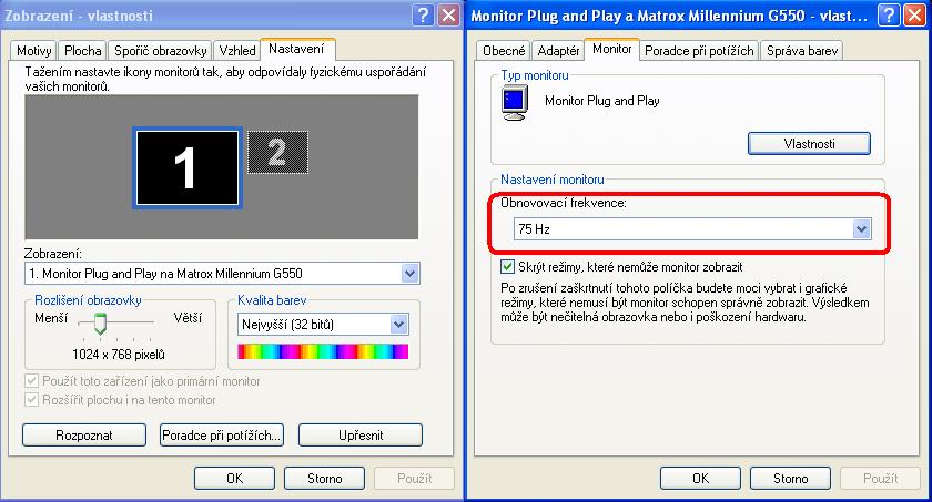 v ''Vlastnosti grafického adaptéru'' a při snížení jsme to snížili pouze v Rozlišení obrazovky.