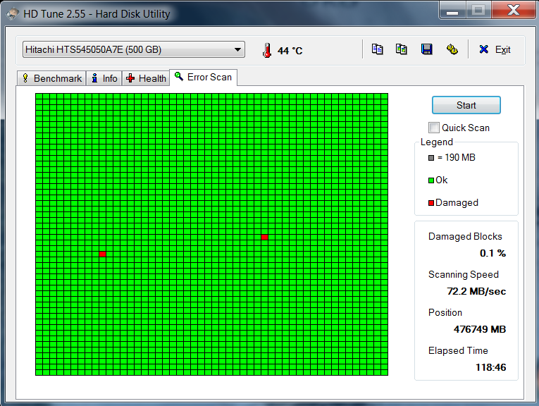 Ten HDD nemá vadné sektory, "jen" podezřelé. Když budeš dělat Error Scan v HDTune, nedělej Quick Scan, je k ničemu! Screen z položky Health Ti ukáže to samé, jako CDI, je to max. pro ověření výsledku CDI, ale snad se mi ještě nestalo, že by se to lišilo.