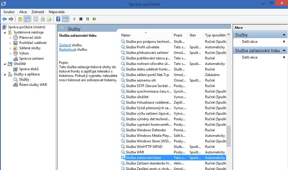 Odebral jsem tiskárnu, resetoval počítač, ale když chci tiskárnu přidat, žádnou to nenalezne a když ji chci přidat manuálně (zařízení a tiskárny->přidat tiskárnu), tak mi vyjede chybová hláška "Systém Windows nemůže spustit Průvodce přidáním tiskárny. Místní služba zařazování do tisku není spuštěna, resetujte službu, nebo počítač"