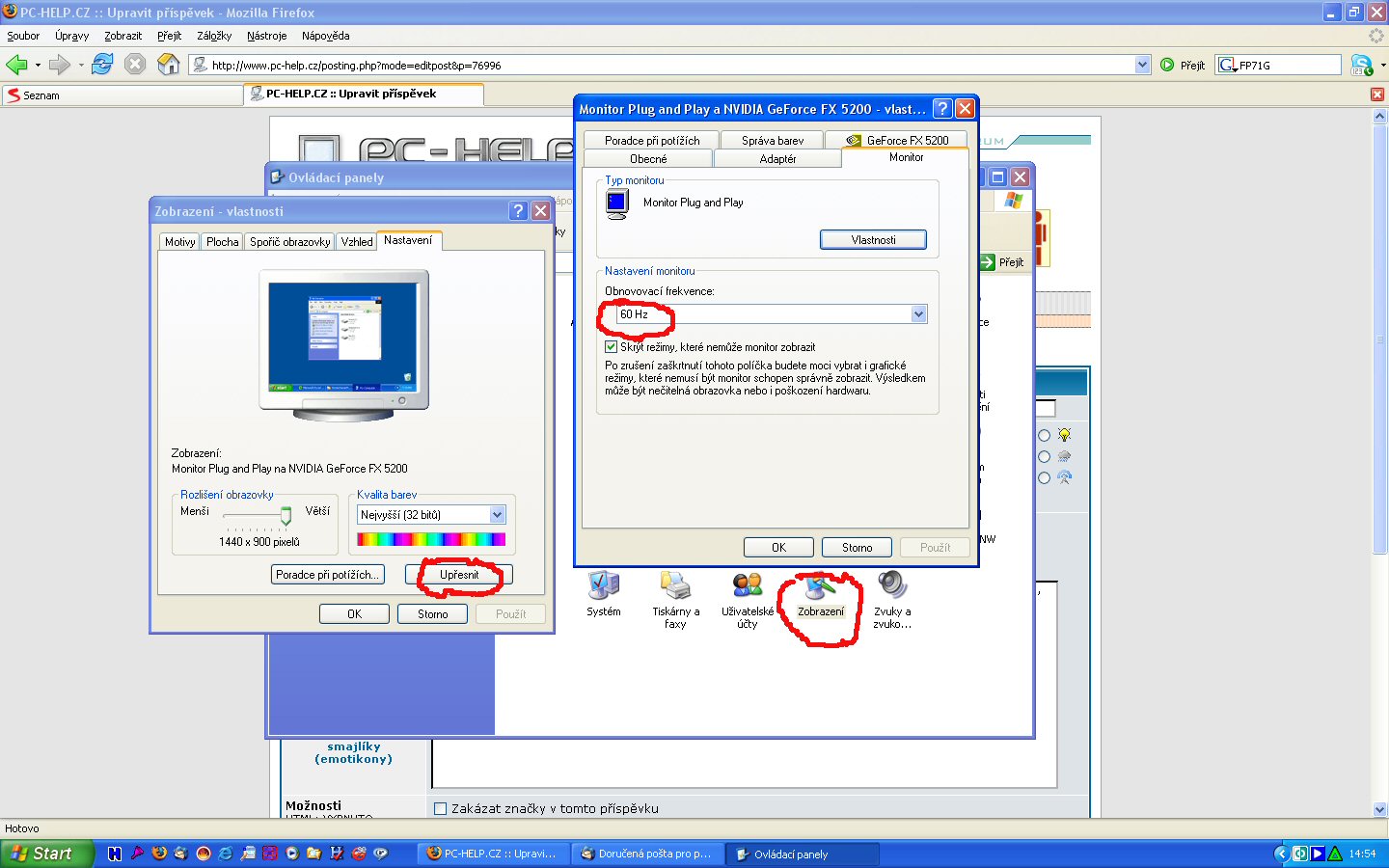 Díval jsem se na tvůj monitor a napadlo mne, jestli nemáš nastavenou příliš velikou obnovovací frekvenci. Na obrázku je naznačeno, kde hledat a nastavit. Nastavení a kontrolu proveď se starým monitorem. Po případné změně nastavení nezapomeň změnu potvrdit klikem na tlačítko [použít]. Do vlastností monitoru se dostaneš buď poněkud komplikovaně, jako já přes ovládací panely (viz obrázek), nebo jednoduše klikneš pravým myšítkem na plochu.