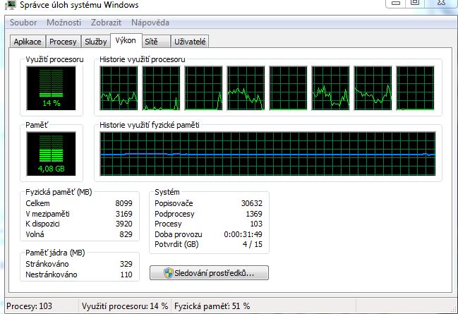 Když v přůběhu zátěže počítače dam ctrl+alt+delete a výkon pc, tak procesor většinou neběží na víc jak 40% a RAMka max na 50%(viz. screenshot).