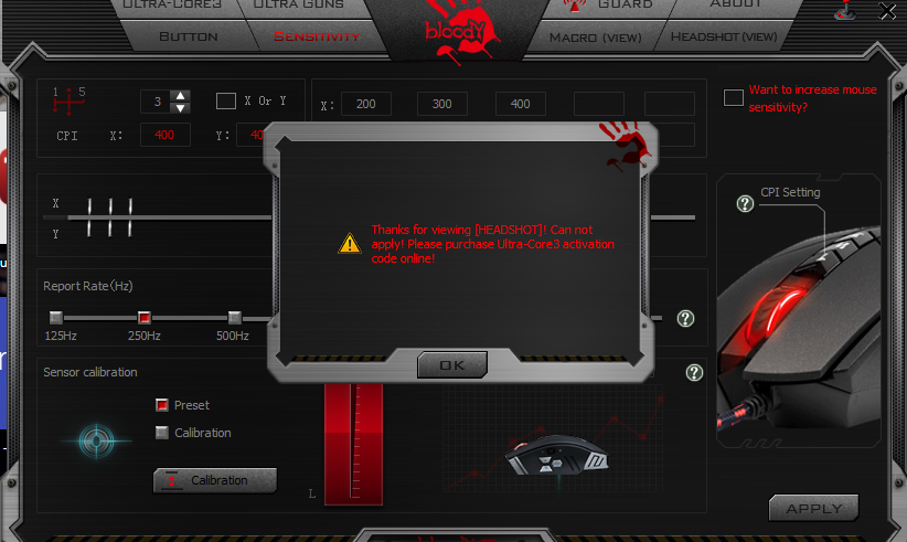Myš mám půl roku, ale dlouho sem citlivost neřešil (nehrál sem žádné hry), ale když sem si zase chtěl zahrát svoji oblíbenou gamesu, v ovladači mi prostě nelze nastavit citlivost. A sem si celkem jistý, že krátce po koupi to šlo bez problémů. Ted mi to napíše chybovou hlášku (viz příloha). Opravdu to znamená že si musím koupit software jen pro to abych mohl změnit dpi? :wtf: Vždy když kliknu na apply, tak se mi to tam vyskočí .... Za radu budu rád.
