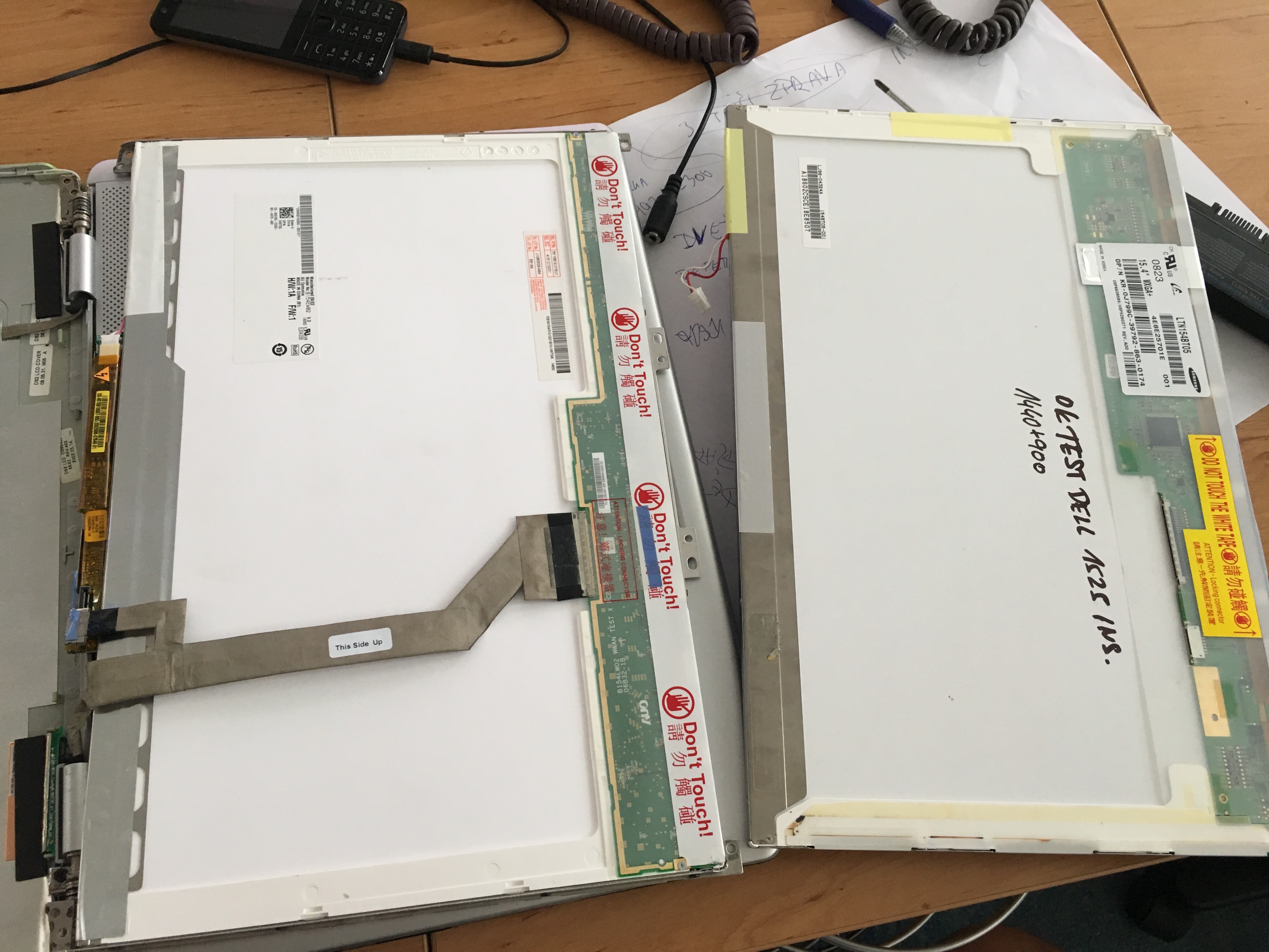 Co je na opacne strane ? Ten konektor co do nej vede cerveny a bily drat je napajeni lamp, a je na obou displejich na tom samem miste. Jen na puvodnim displeji je zapojeny do invertoru, to je ta podlouhla deska s elektronikou co je na ni symbol blesku. Hned vedle toho blesku mas zapojeny ten samy cerveny a bily kabel, jako mas na druhem volny. Invertor musis prendat na novy displej.