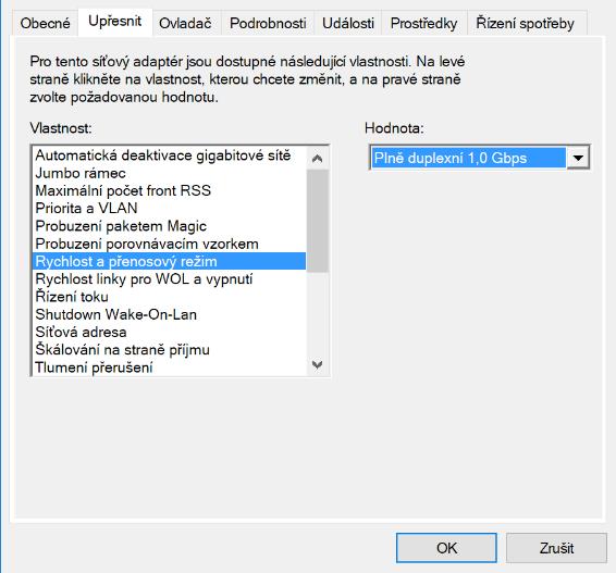 No tam jsem chtěl rychlost změnit, ale volba 1Gb/s tam vůbec není.