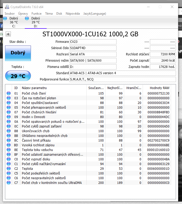 U toho Seagate zkus párkrát vysunout a zasunout do konektoru datový kabel na obou koncích. Jinak opotřebení odpovídá provozním hodinám. Nic zásadního pro výměnu.