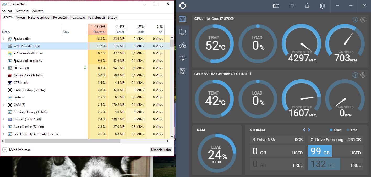 Vsiml jsem si, ze spravce uloh mi ukazuje vytizeni procesoru na 100% a dalsi dva programy a to CAM a Process Explorer ukazuje jen nekolik malo procent. Za dalsi procesor je taktovan na 3.7 MHz a permanente mi procesor na CAMu ukazuje ze jede na 4.3 MHz. Nejak sem z toho blazen. Prikladam dva screeny s programama.