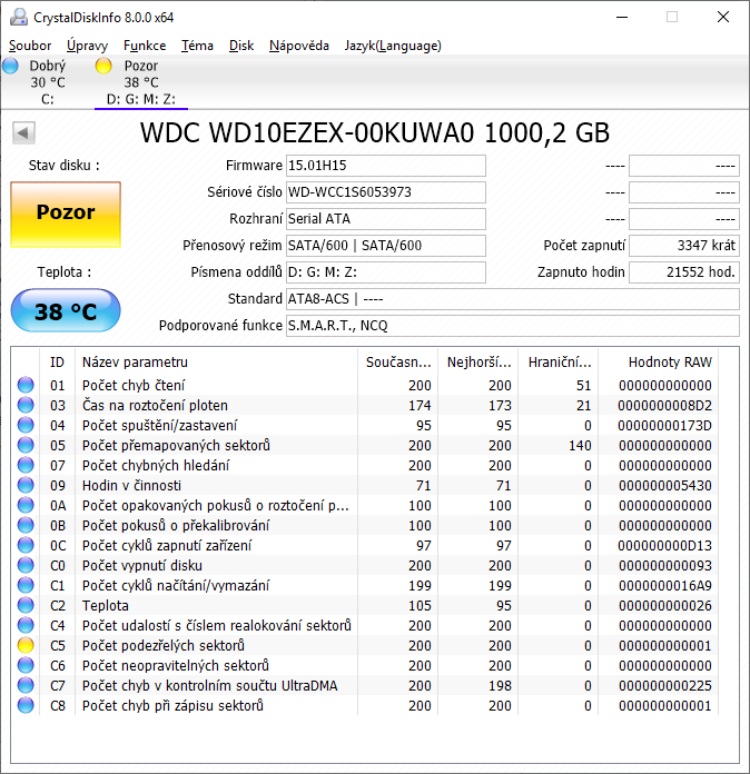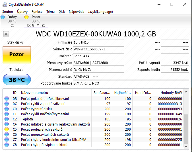 Je tam také dost chyb přenosu dat.Tahle hodnota je souhrnná za život disku, ale i tak je vysoká. Zkus vyměnit datový kabel za jiný.