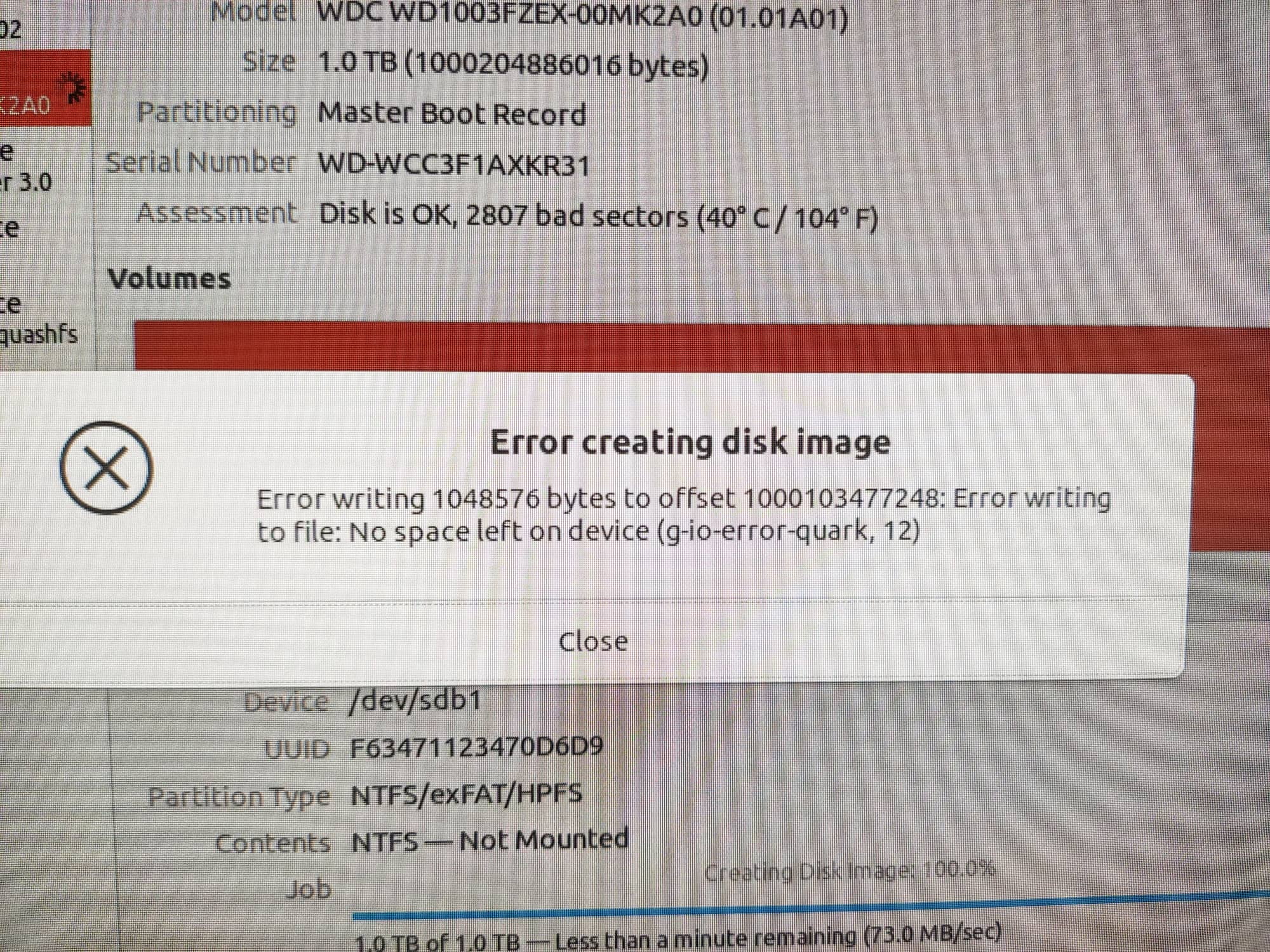 Tak jsem koupil 2TB hdd, dělal jsem image toho poškozenýho hdd (v ubuntu), dojelo to do 100% a hodilo to chybu, že je disk plnej. To jako že se 1TB soubor nevejde na 2TB prázdnej disk. :)