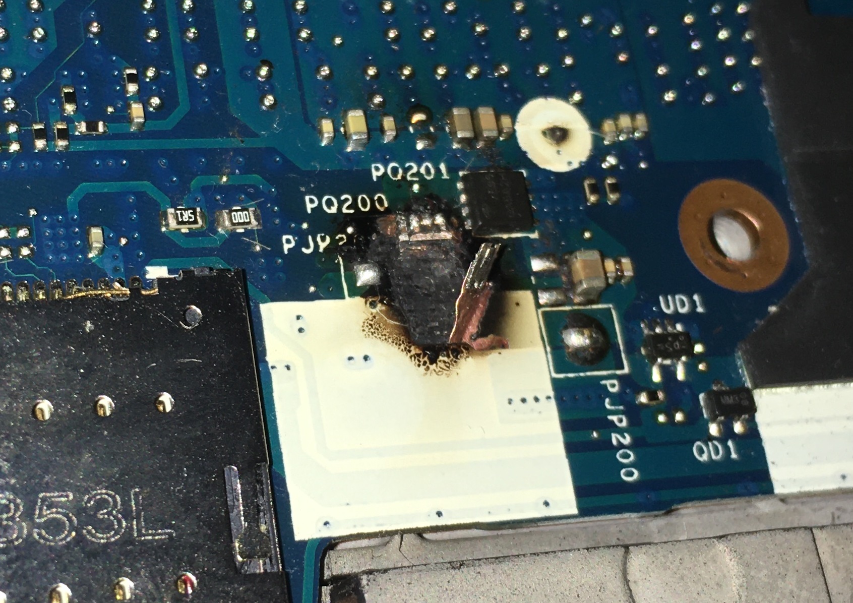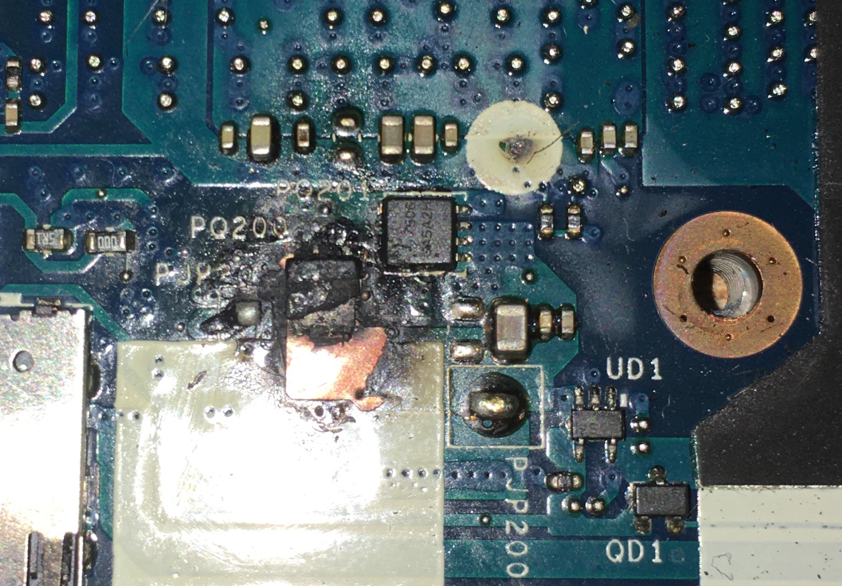Zdravím, řeším problém s notebookem Dell Latitude E7450 (i5 5200u (nebo 5100u, 5300u, teď nevím co tam bylo), integrovaná karta, 8GB RAM). Při práci prý zamrzl, problikl obraz a vypnul se. Notebook jsem rozebral a na základní desce jsem našel spálenou součástku. Netuším o jakou součástku jde, ale okolní s podobným označením jsou mosfety (AON7408 - ???). Co jsem se ale díval na fotky základních desek do tohoto notebooku, některé tam tuhle součástku vůbec neměly (takže jestli by šel notebook provozovat i bez ní, to netuším).