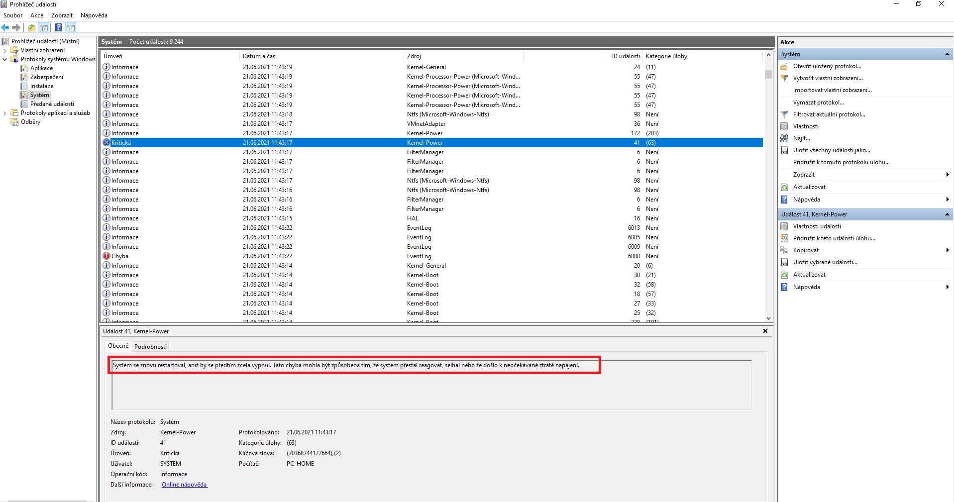 tak tohle se tam objevuje, vždy po tom pádu, ta kritická chyba, jenže to mi stejně jen řeklo, že to může dělat cokoliv že ? navíc si myslím, že ta hláška v tom červeném poli už je důsledek toho mého fyzického restartu,ale ten důvod toho selhání to asi není..či ne ?