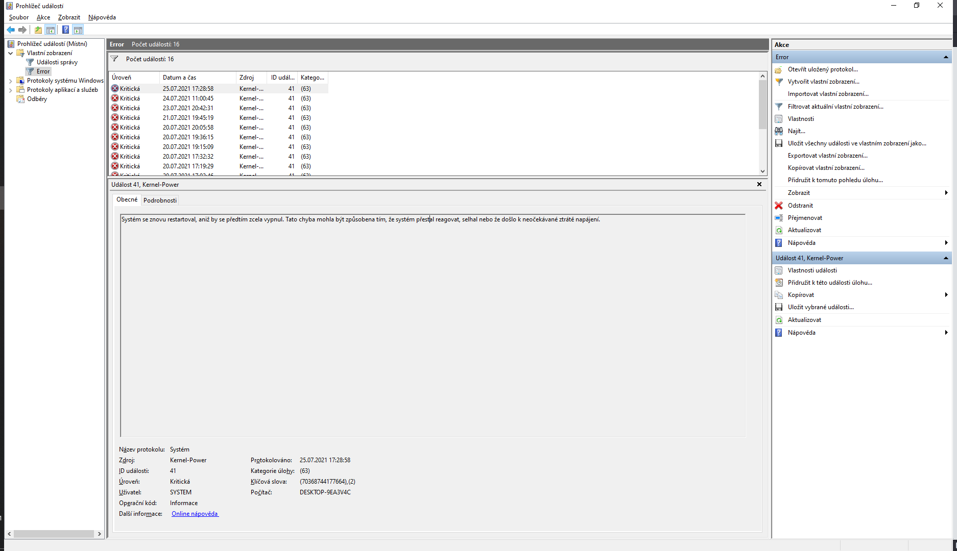 Přikládám screen, jediná kritická chyba je Kernel-Power .. nic jiného mi to nedělá .. Grafika tedy by měla jet v pohodě .. jediné co mě napadá je špatný zdroj, kupoval jsem rozbalený kus protože byl o něco levnější, takže je možné že ten kdo ho měl přede mnou měl ten samý problém a vrátil ho do 14ti dnů ... Je teoreticky možné že zdroj občas jakoby vypne? Protože když se mi tohle stane, vypne se zvuk, grafika ale větráky a ramky jedou stále ..