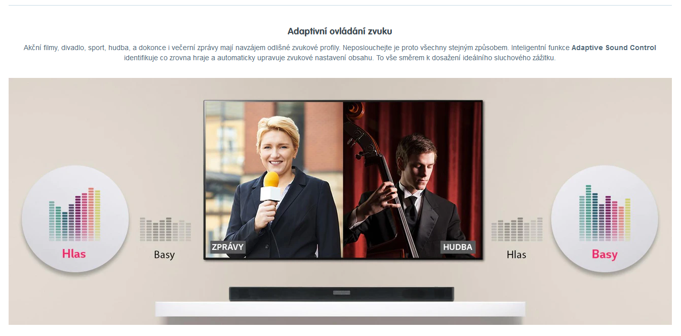 Akční filmy, divadlo, sport, hudba, a dokonce i večerní zprávy mají navzájem odlišné zvukové profily. Neposlouchejte je proto všechny stejným způsobem. Inteligentní funkce Adaptive Sound Control identifikuje co zrovna hraje a automaticky upravuje zvukové nastavení obsahu. To vše směrem k dosažení ideálního sluchového zážitku.