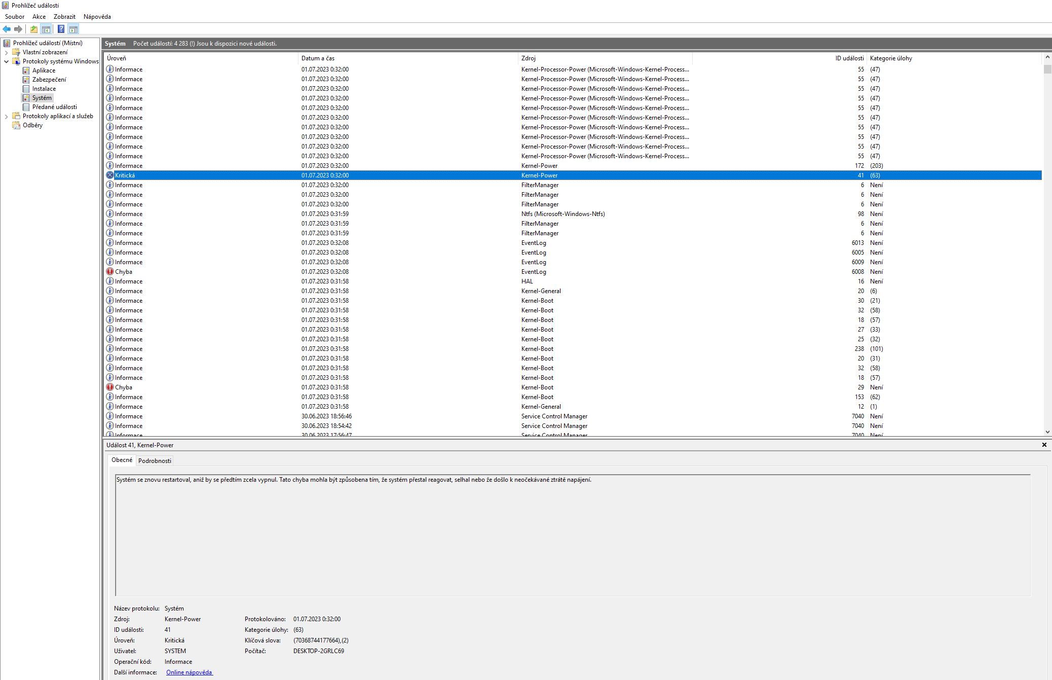 Chyba - Událost 41, Kernel Power