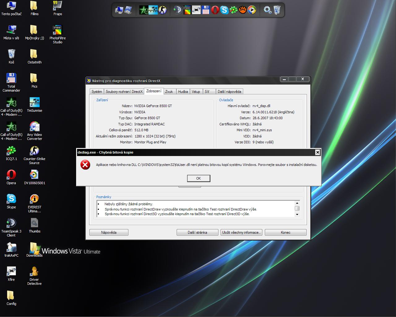 mám problém s ovladači ke grafické kartě, nedávno jsem instaloval ovladače na grafickou kartu Radeon, kterou jsem měl půjčenou na pár dní, ale nyní, mi nejdou ovladače na grafickou kartu nVIDIA GeForce 8500GT a při příkazu dxdiag, mi hlásí jakousi chybu, která je přiložená na obrázku, za odpovědi předem děkuji.
