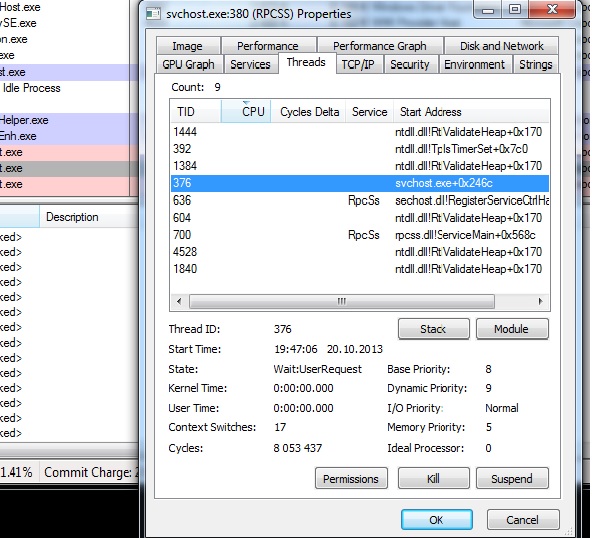 Pak zkusil spustit PE z plochy, on naběhl, ale najednou ten svchost.exe klesl a začalo to fungovat. Vůbec netuším proč.