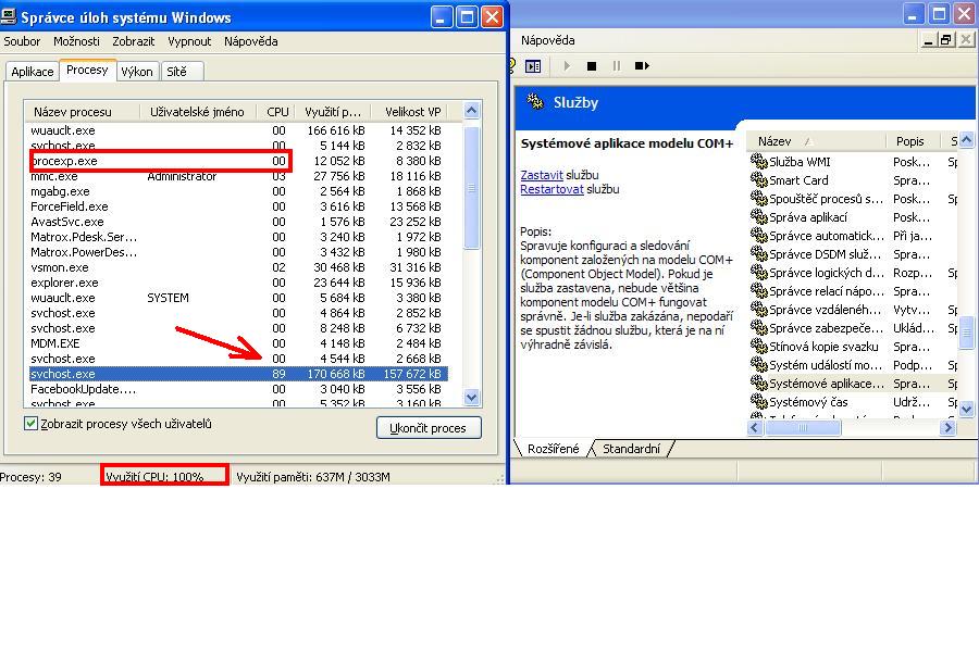 Ihned po zapnutí jsem spustil Správce úloh a Proces Explorer. Svchost.exe vystoupal na 99% a PE se ani nehnul, jenom se objevil ve správci úloh. Čekal jsem půl hodiny a nic. Viz. příloha. Tak jsem PE ve správci úloh ukončil a zkusil spustit služby. To se povedlo a tak jsem zastavil a zase spustil 4 služby.