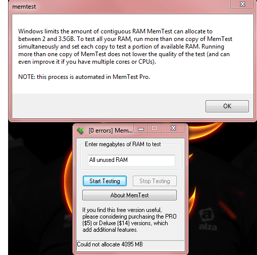 Pokud ponechám políčko All unused RAM tak jak je, nechce se mi test pustit ať dělám, co dělám.