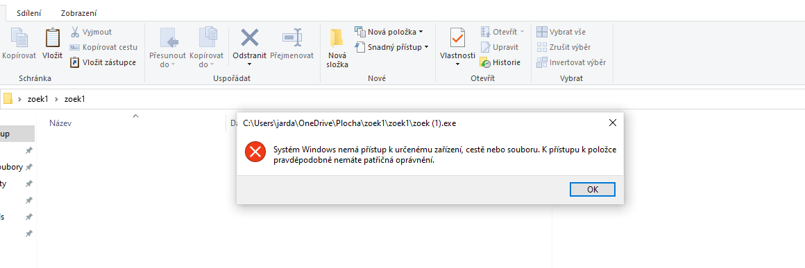 Zoek mám stažený na plochu.. rozbalený.... soubor aplikace tam je... ale když ho spustím ... tak soubor zmizí a objeví se jen... pracujeme na tom (v průzkumníku)... a když ho spustím jako správce.. objeví se ta hláška že zřejmě nemámdostatečná práva ke spuštění..jak jsem posílal minule...