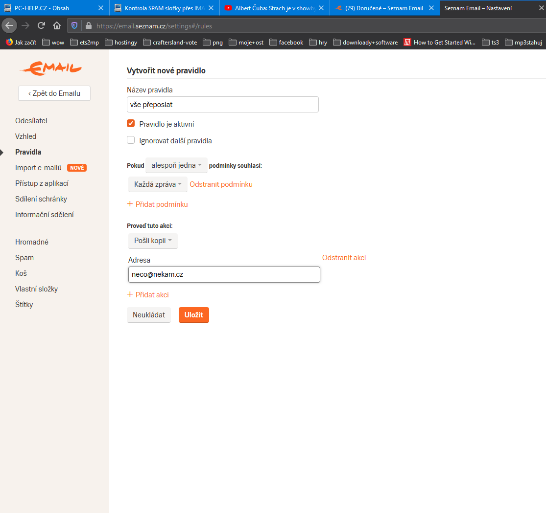 totéž u webového Outlooku. Ovšem podle obrázku, který si mi poslal, to bohužel nelze. Takto to mám nastavené u Seznamu a přeposílá mi to ihned vše, kromě pošty, co vyhodnotili jako spam. A zrovna u Seznamu je to o hodně více často důležitá pošta než u Gmailu a Outlooku. Chvílemi jsem i pojal podezření, že to neumožňují kvůli tomu abych navštěvoval stránky Seznamu. Psal jsem zdvořile na podporu, ale nic s tím nehodlají doslova dělat. Chrání uživatele před spamem a bla bla. :roll:
