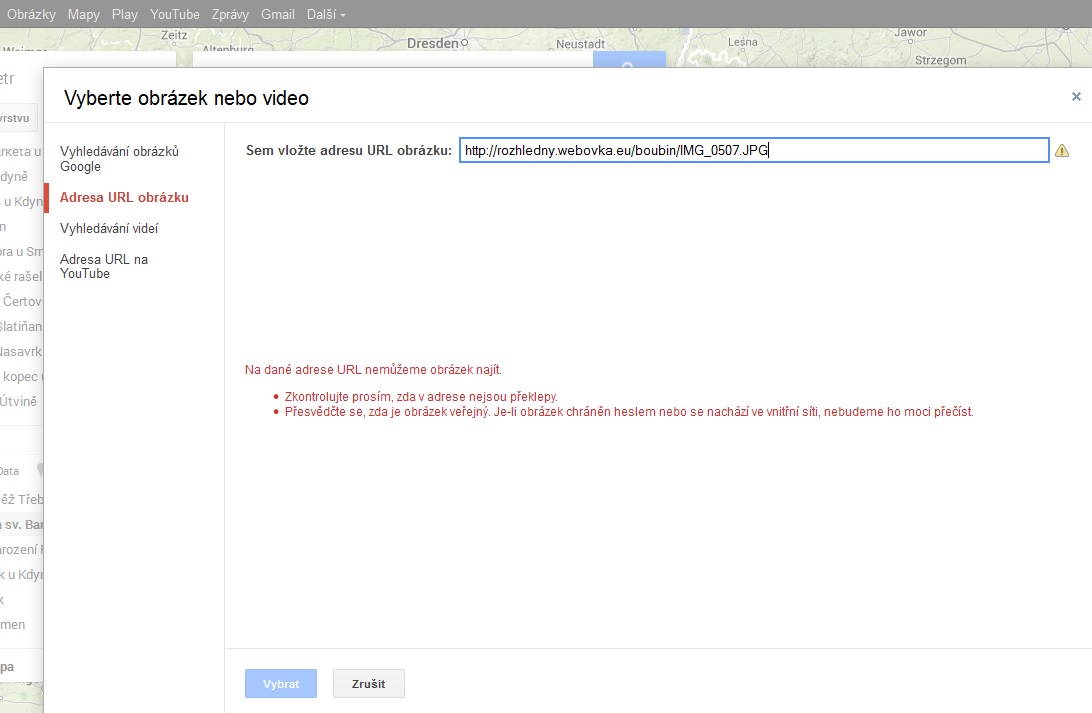 Do google maps nemáš co vkládat fotky z webu, ale máš tam vkládat své vlastní fotky. Z mé vlastní zkušenosti to funguje bez problémů.