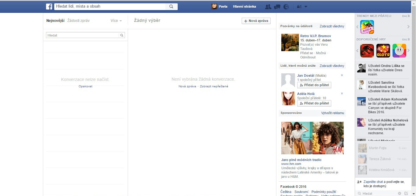 máte někdo zkušenosti s takovouto "facebookovou" chybou? 2 dny mi nefungují zprávy - vůbec se nenačtou a vypadá to jako by byly všechny smazane, což nejsou. Nefunguje ani messenger na telefonu či tabletu. Zkoušela jsem i jiné PC, ale nepomohlo. Popřípadě máte nějaké tipy co dělat? Zprávy na facebooku jsou asi jediná funkce, kterou opravdu používám a celkem mě to limituje. V příloze je printscreen z ntb a mobilu.
