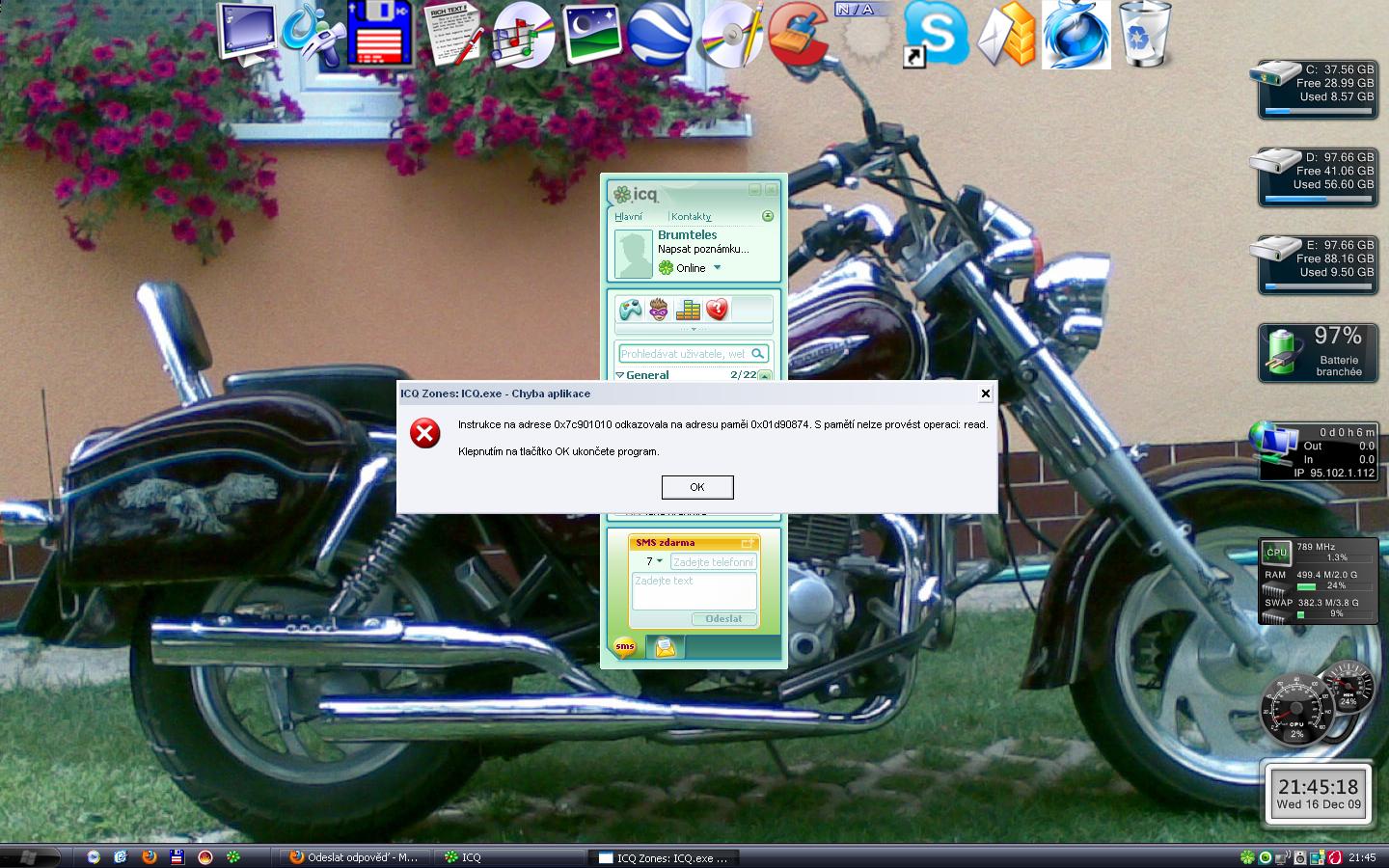 Spustil som memtest a všetko je OK. Nainstaloval som Javu, Net Framework, Microsoft Visual C++, Windows instaler a stále je to to isté. Icq sa spustí a asi po 10-15 sekundách nabehne tá hláška z prvého screenu. Po jej odkliknutí naskočí tá druhá a po nej sa icq ukončí. Už neviem čo stým. :evil: Kto vie nech poradí. Dík.