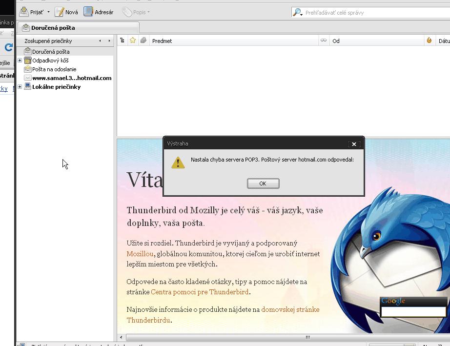 Reinštaloval som XP sp3 ( Anglická verzia Sj doinštalovaný) a kedže poštového klienta mám Thunderbird tak som ho inštaloval....ako predtým. Problém je že ma neprihlási na hotmail.com a skončí to hláškou "nastala chyba POP3.Poštový server hotmail.com odpovedal: " vid obrázok. Ak sa prihlásim na hotmail v gooli neni problém. Neviete čo s tým? Poradíte?