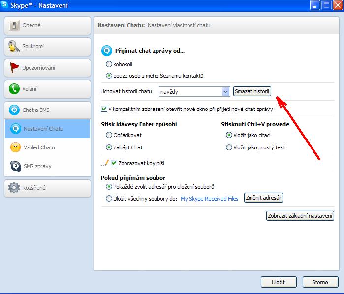 Skype > nastavení > nastavení soukromí > historie