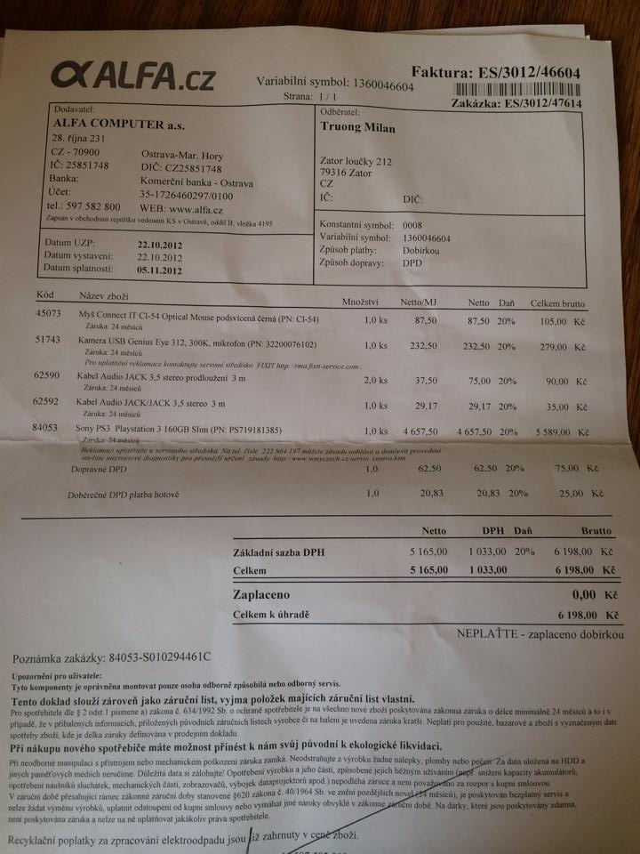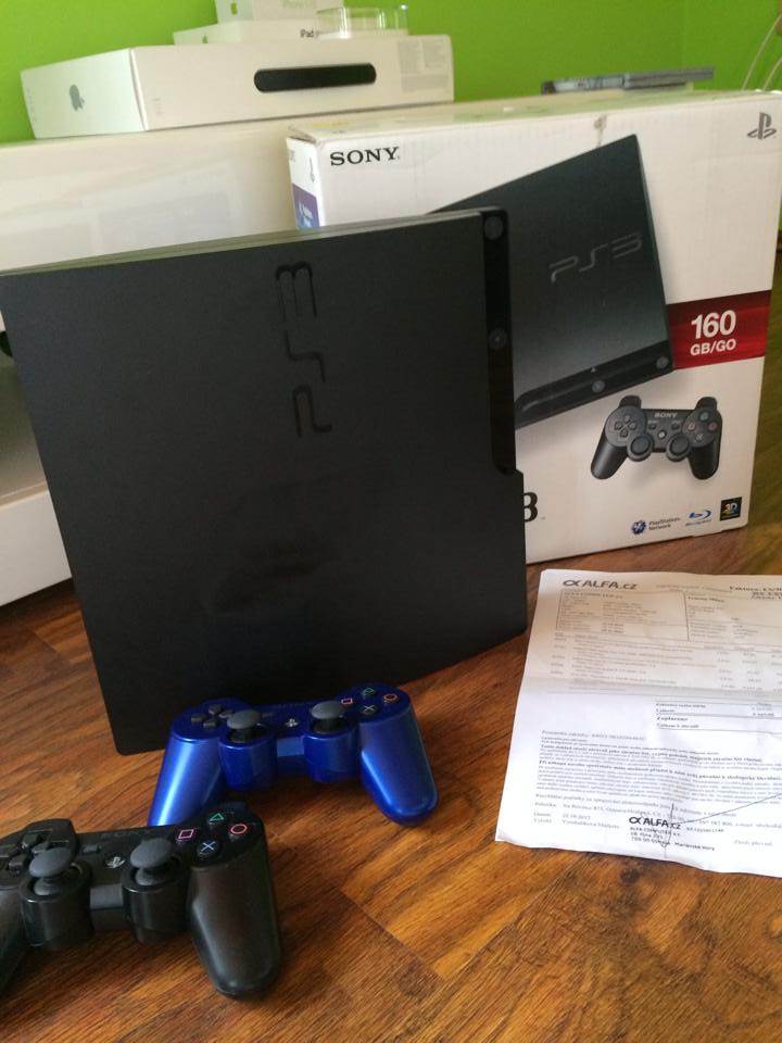 Nabízím již zmiňovaný PS3 Slim o kapacitě 160Gb má ještě záruku u Alfacomp do 5.11.2014 viz. foto. Playstation funguje, načitá rychle, problémy žádný, jediná vada je flek na horním plastu, který udělal čistící prostředek. Mě osobně to nevadilo měl jsem PS3 schovaný ve stolku. Je udržovaný a čištěný. Přidávám také 2x Dualshock 3, modrý je nový jen rozbalený nepoužitý. Komplet balení.