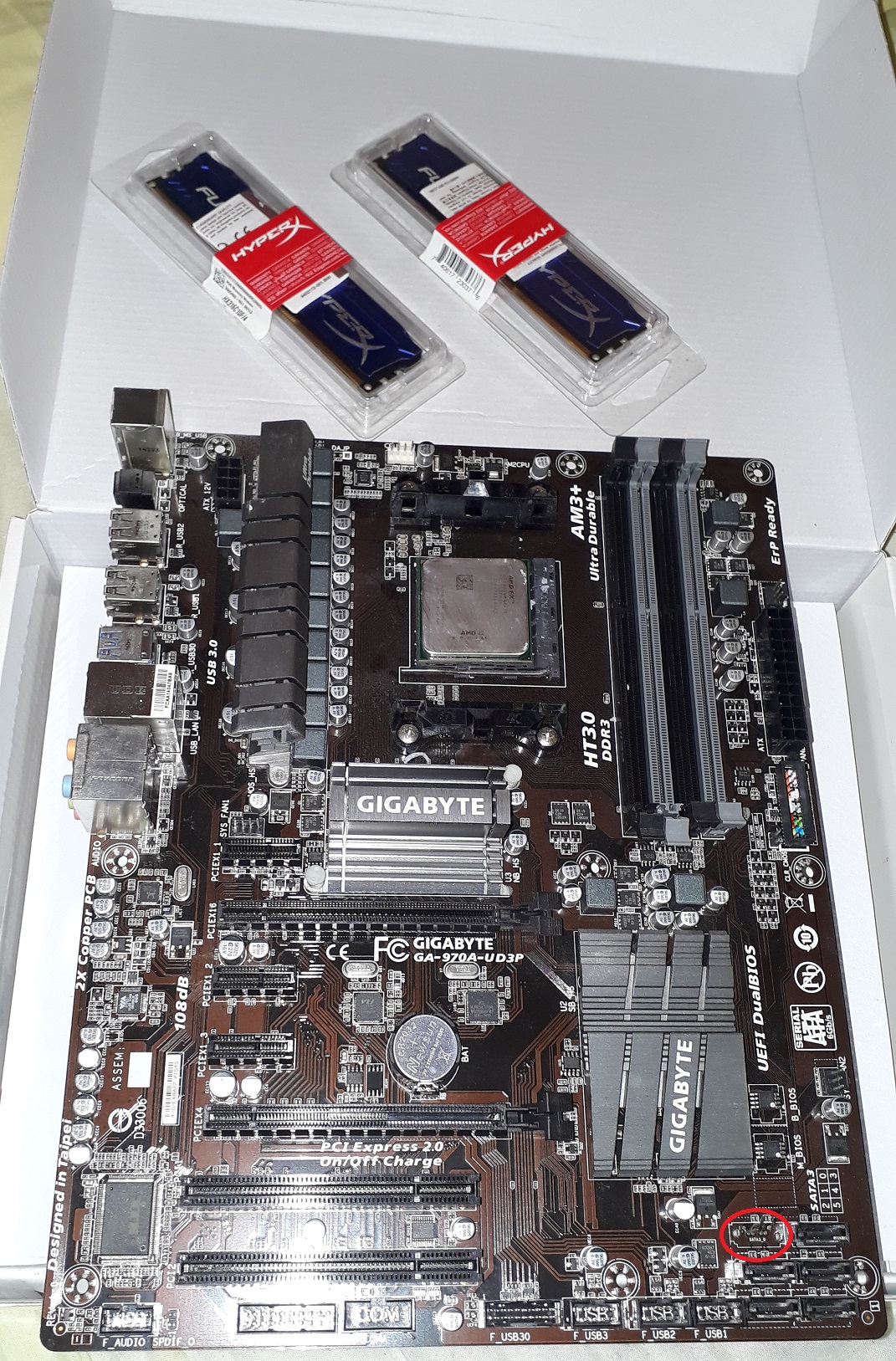 Deska má ulomený 1 SATA slot (viz. červený ovál), takže zbýva dalších 5, o žádných jiných závadách nevím. PC denně v provozu.