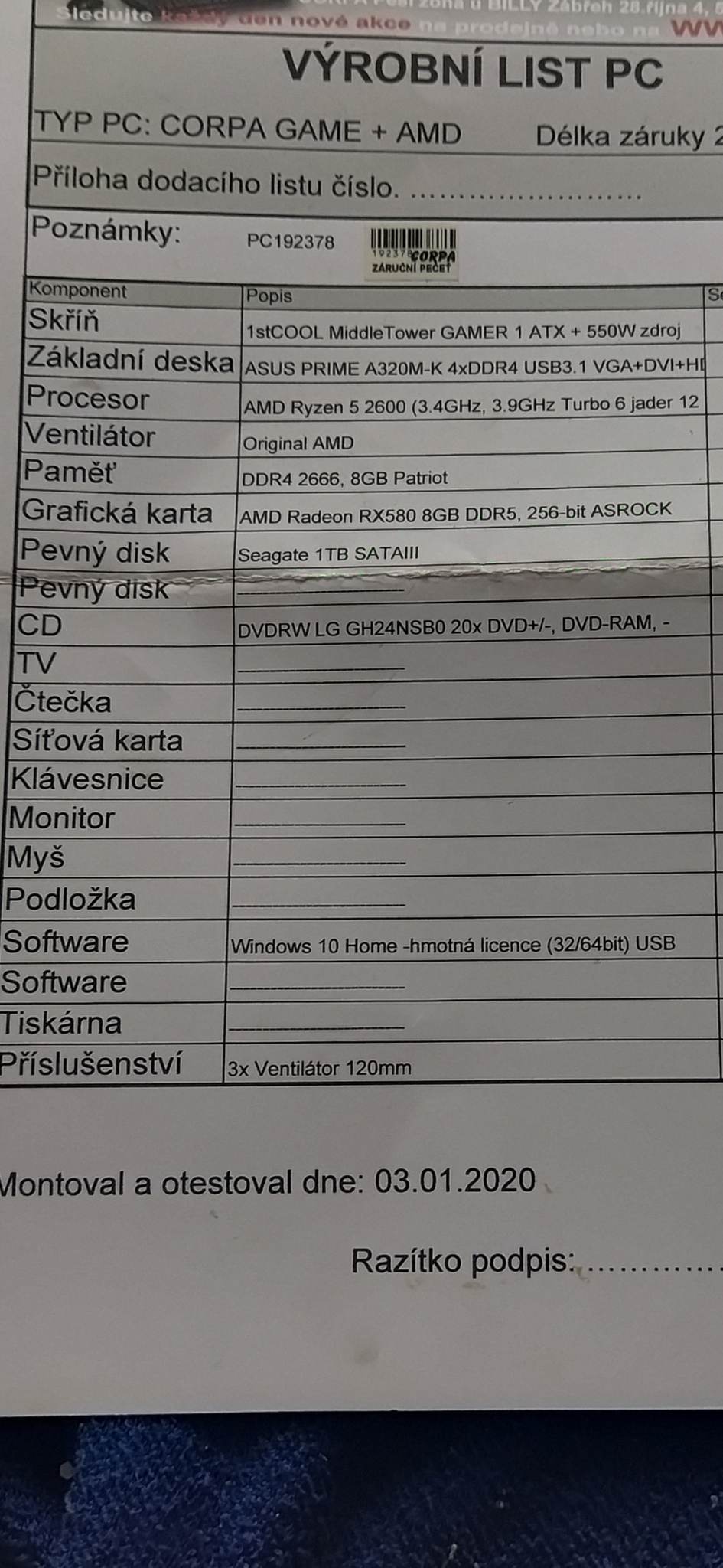 Chybí detailní popis. Jaký RAM, jaký zdroj, bedna, disk atd.