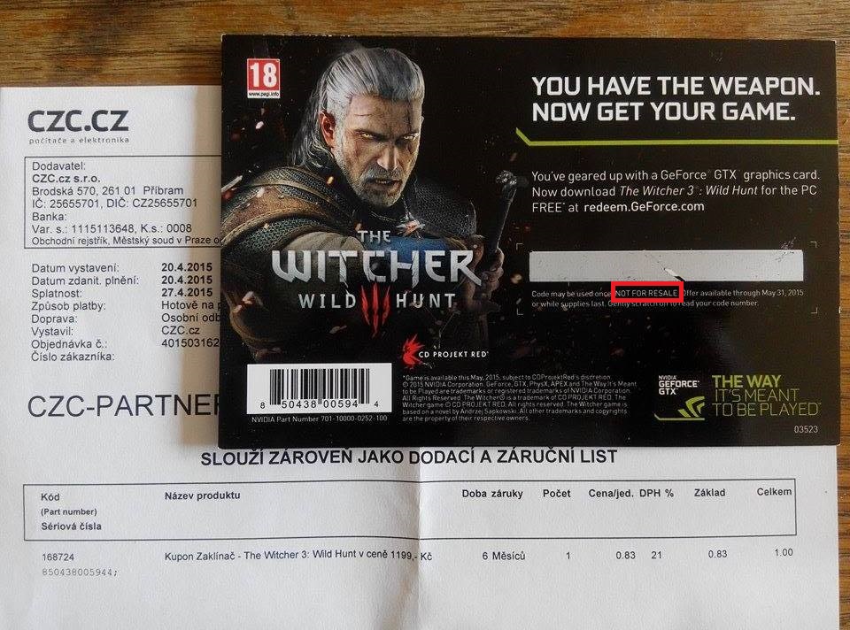 Prodám Zaklínače 3 dostala jsem ho jako dárek ke grafice, ale hrát ho nehodlám. Cena 1000 Kč + poštovné nebo možnost že lístek seškrábu a CD KEY pošlu na email.