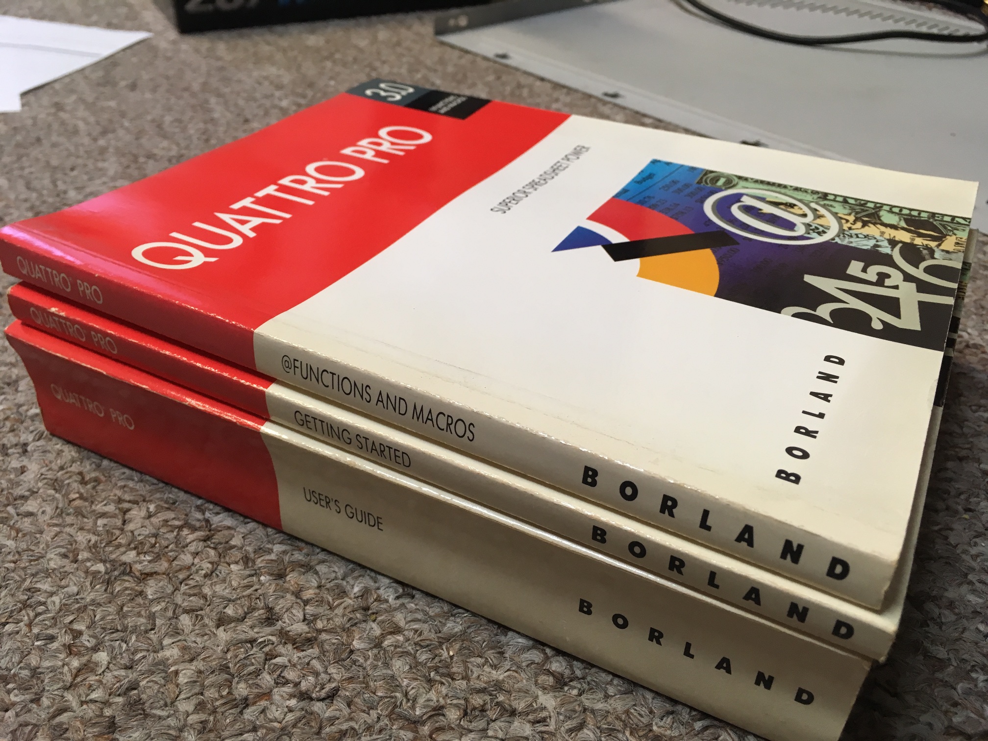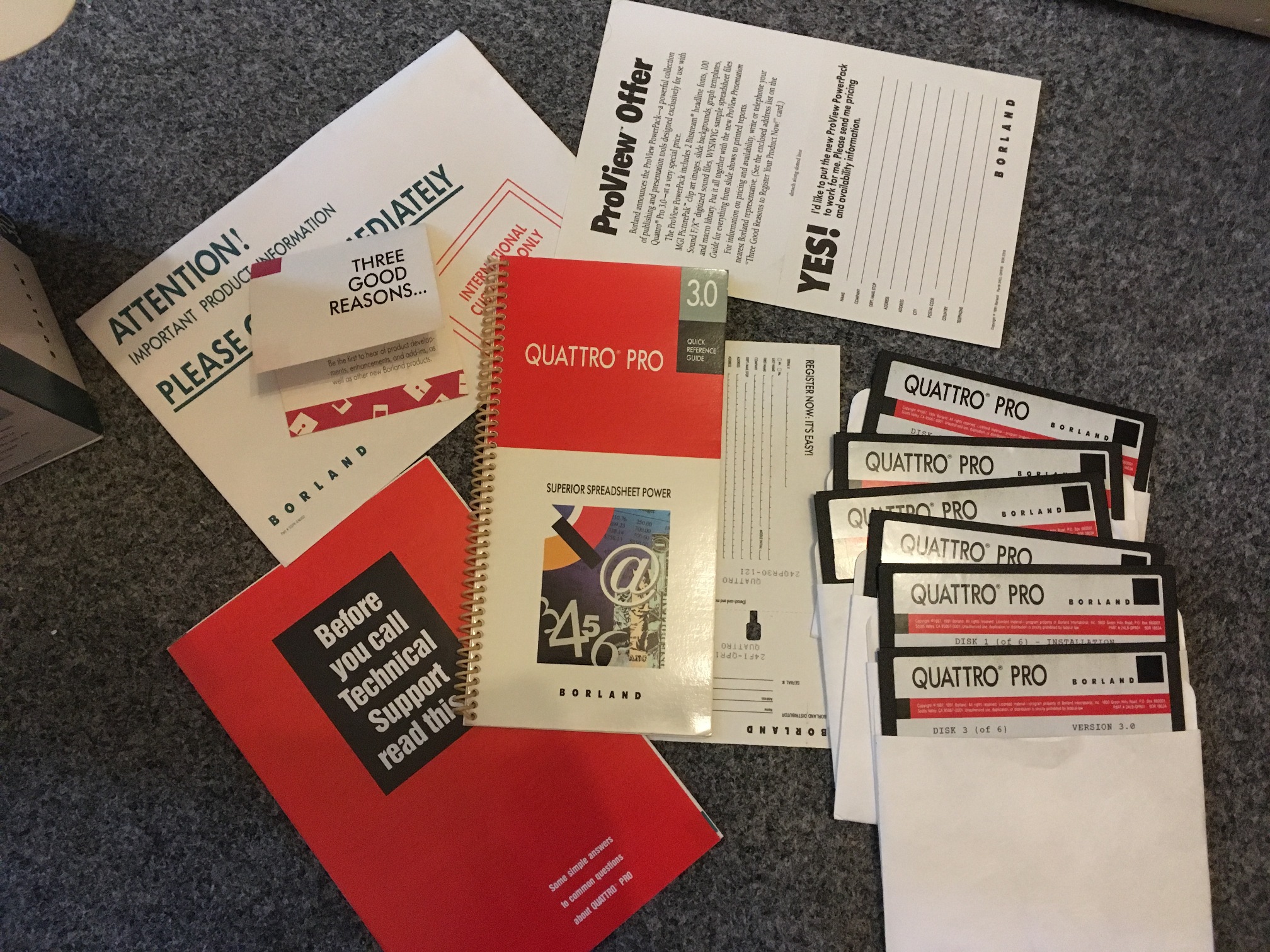 Našel jsem na půdě krabici se starým kancelářským programem Quattro 3.0, kompletní balení se všemi šesti disketami+ nějaké letáčky atd.. +nějaké knížky o programu..