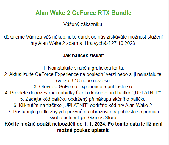 Re: Prodám PC hru Alan Wake 2 GeForce RTX Bundle