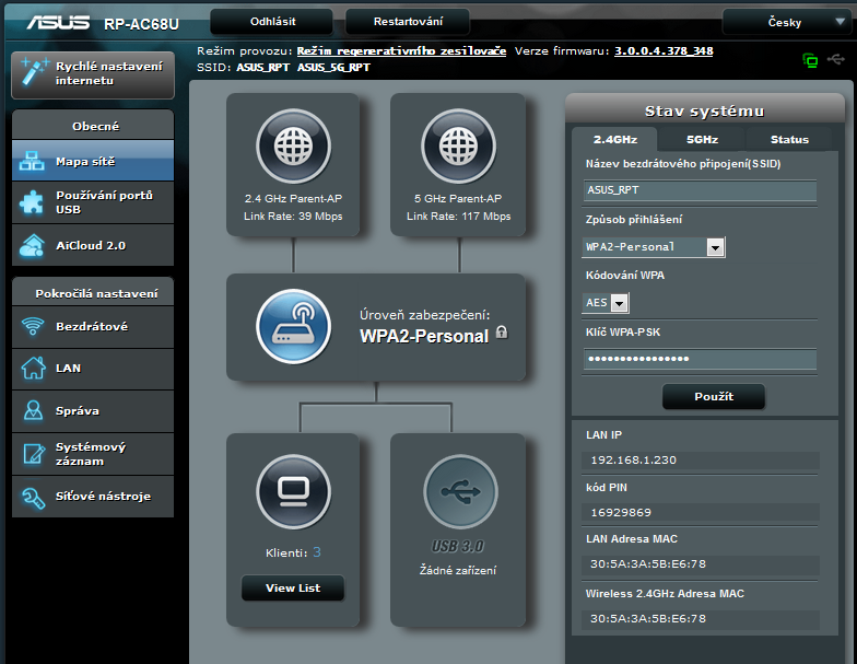Pro zprovoznění dalších funkcí již musíme do menu repeateru. Rozhraní se podobá rozhraním, jež ASUS používá u routerů. Jako první položka je přehledná mapa sítě. Zde najdete shrnutí všeho důležitého, včetně režimu v jakém repeater pracuje, verzi FW, připojeného USB atd.