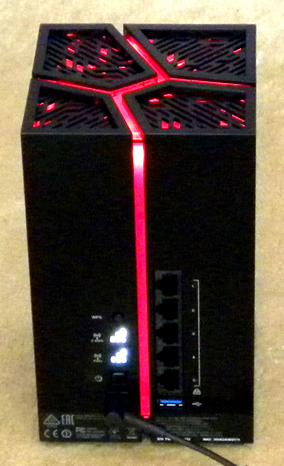 V krabici najdete repeater, napájecí zdroj, síťový kabel a manuál, kde nechybí čeština. Design je koncipován do čtvercového kvádru černé barvy, kde spoje jsou podsvíceny červeně. Nápisy jsou ve stříbrné barvě. Na zadní straně najdete pět LAN portů, USB port, WPS tlačítko, vypínač a indikátory signálu - pro pásmo 2,4 a 5 GHz. Už z vybavení je jasné, že nejde jen tak o nějaký repeater.