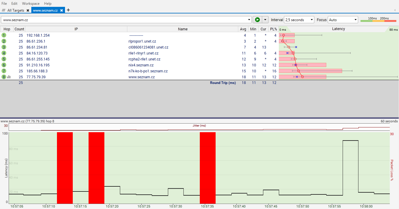 Program nech běžet, dokud nedojde k výpadku. Po výpadku můžeš proces zastavit a dát sem do přílohy screenshot.Stáhni https://www.pingplotter.com/freeware.html, nainstaluj a spusť. Do pole Target Name napiš www.seznam.cz, Trace Interval zvol 2,5 second a klikni na zelené tlačítko "play".