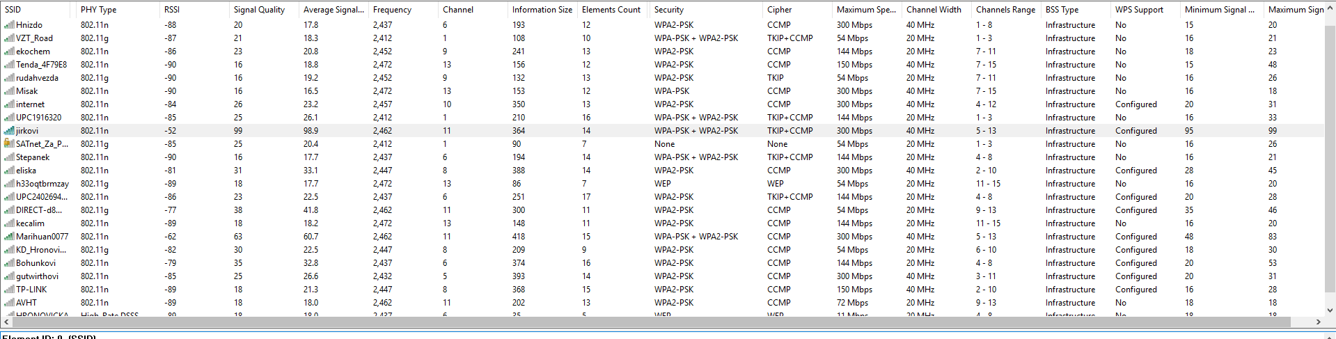Pokud jde o WiFi, tak zdaleka nejsilnějším zdrojem potenciálního rušení je síť "Marihuan0077", se kterou tvoje WiFi síť sdílí úplně stejné frekvence (kanály 7+11, šířka 40 MHz). Jako vhodné se jeví přepnout na kanál číslo 1, pokud možno s použitím šířky 20 MHz. Ostatní sítě, hlavně ty silnější, jsou na kanálech 6 a výše. Ale PingPlotter rozhodně stáhni a dle návodu od kolegy použij, ať zjistíme, kde k problému dochází.