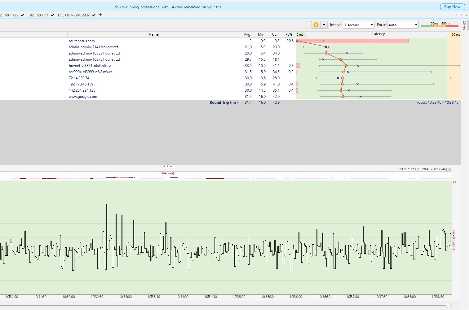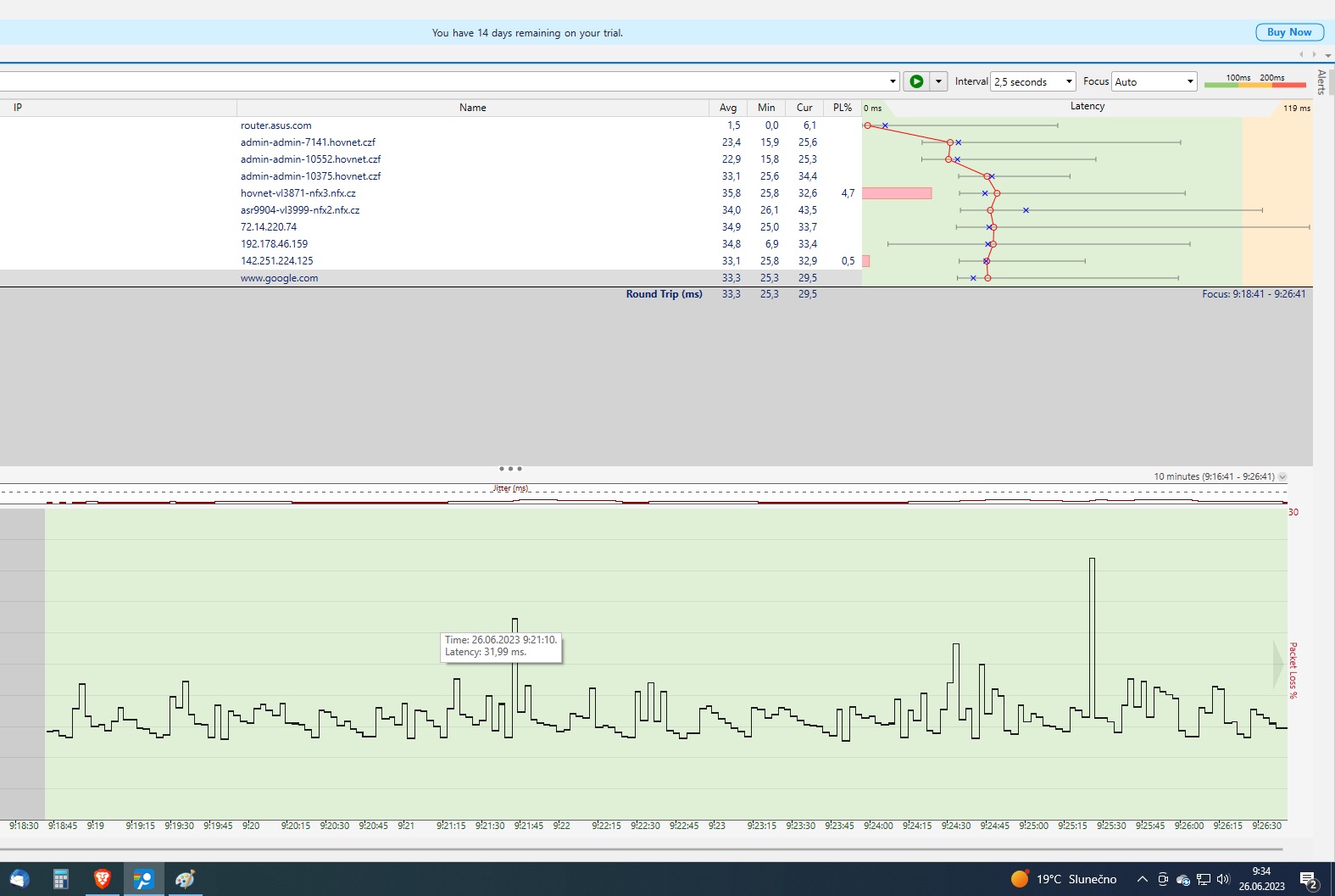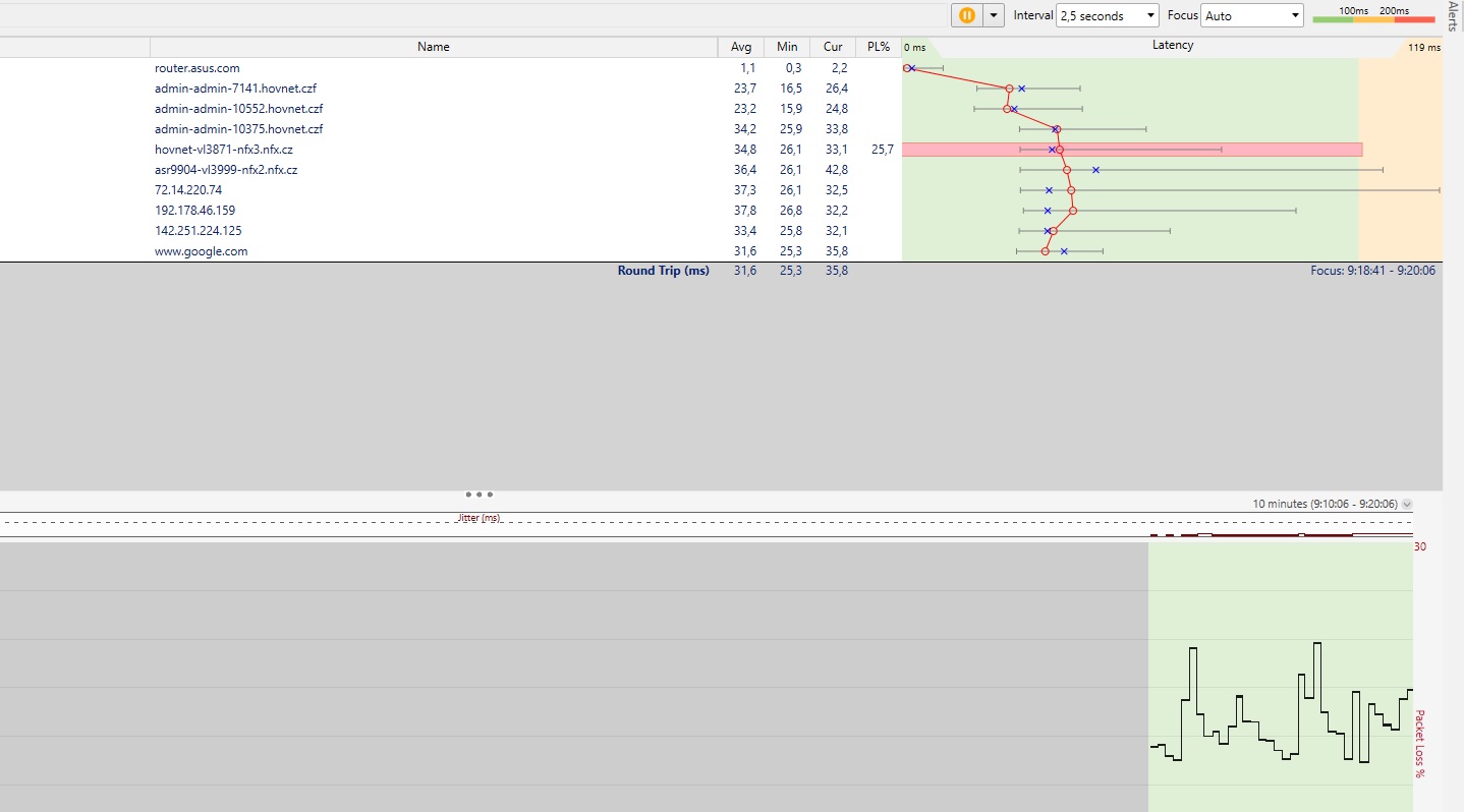 3. spustis napriklad PingPlotter proti webu Google, ten by mohl ukazat kde presne dojde k preruseni komunikace