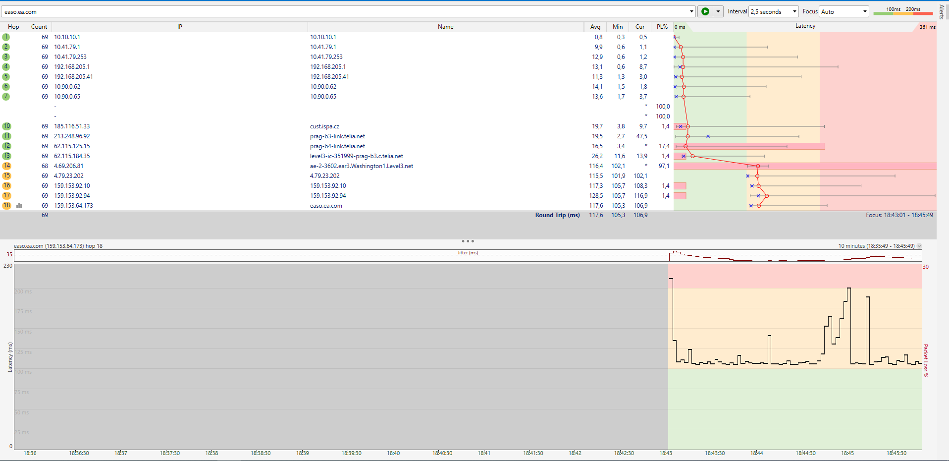 Hlavní problém bych viděl na 14. hopu 4.69.206.81, kde je ztraceno 97% paketů.