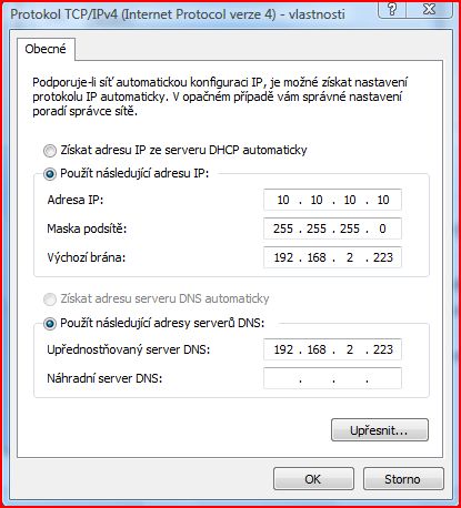 V notebooku nastavíš to, co jsem psal, akorát IP brány a DNS bude 192.168.2.223 .