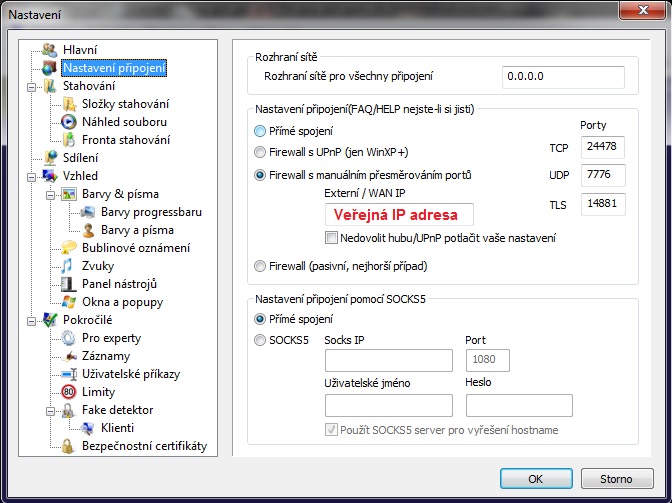 Rozhraní sítě pro všechny připojení: 0.0.0.0 (Any) -> (tady je ještě možnost zvolit svou LAN ip PC a to 192.168.1.4).